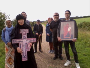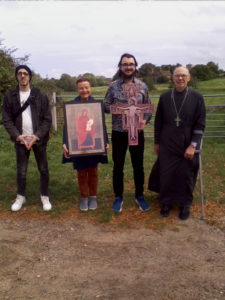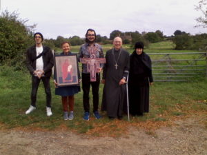 La journée a commencé par la célébration de la Liturgie Divine dans la chapelle orthodoxe de l’église sanctuaire anglicane, célébrée par le Père Julian Sadowski de la paroisse Saint-Jean le Théologien à Norwich, suivie d’un déjeuner partagé dans la salle des pèlerins. Après le déjeuner, les pèlerins se sont dirigés vers la chapelle de Chausson au sanctuaire catholique romain de Notre-Dame de Walsingham à Houghton-St. Giles pour une procession de la Croix. Le Père Julian, qui se remettait d’une opération de remplacement de la hanche, est venu envoyer les pèlerins sur leur chemin, alors qu’ils parcouraient le Mile Sacré jusqu’à la Maison Sainte du sanctuaire anglican, chantant et priant le long du parcours de pèlerinage. À leur arrivée, ils ont été rejoints par le Père Julian, ainsi que par le Père Mark et Matushka Elizabeth Tattum Smith, de l’Église de la Joie de Tous Les Affligés à Mettingham.