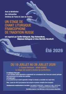 Avec la bénédiction des métropolites Dimitrios de France et Jean de Doubna, un stage de chant liturgique orthodoxe francophone de tradition russe est organisé par Olga KOLESSNIKOW, Irène MARIETTE-KOROTKOFF, Cyrille et Stéphane SOLLOGOUB.