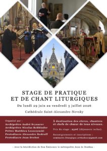 Avec la bénédiction de Son Éminence le métropolite Jean de Doubna, un stage de pratique et de chant liturgiques est organisé pour la sixième année consécutive à la cathédrale Saint-Alexandre-Nevsky, du lundi 29 juin au vendredi 3 juillet 2026.